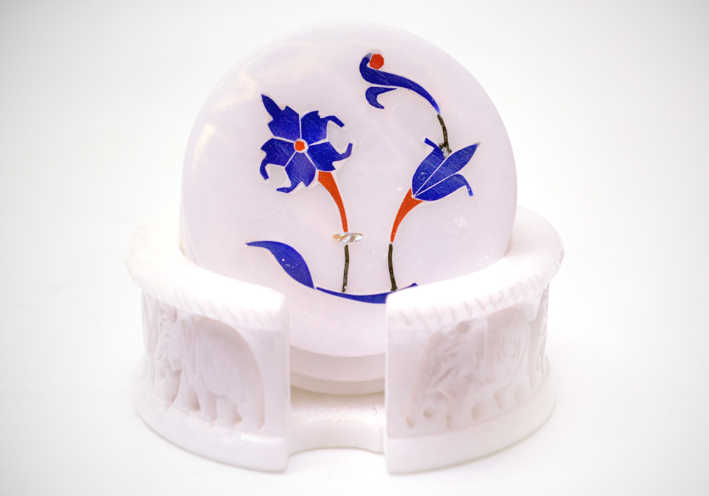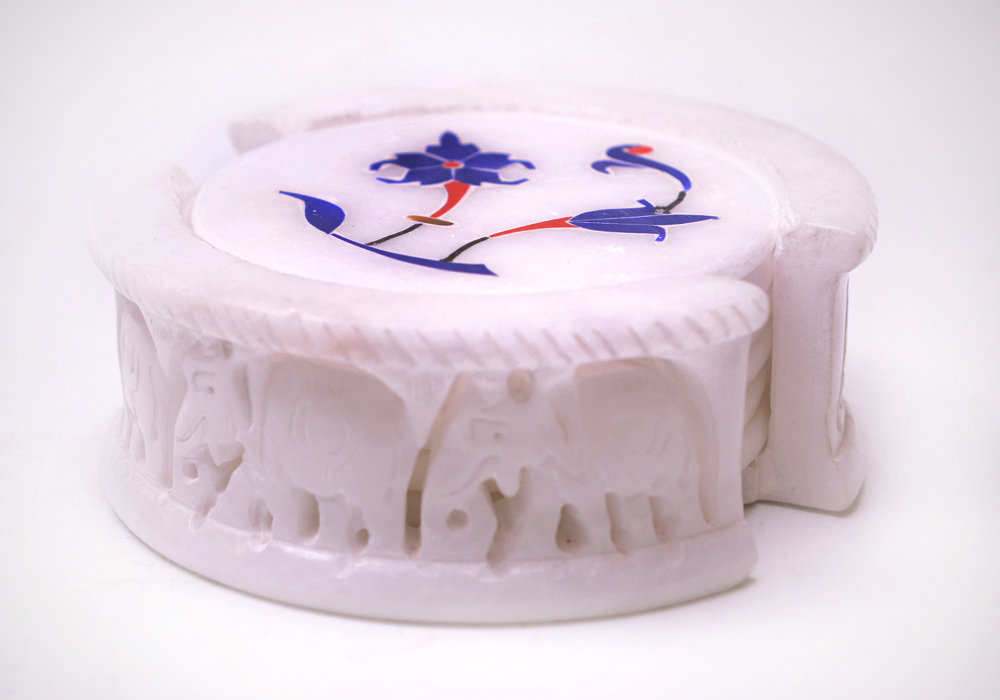 Elephant Coaster Set With Inlay Lepis,Coral,Shell pearl Stones Work In White Marble