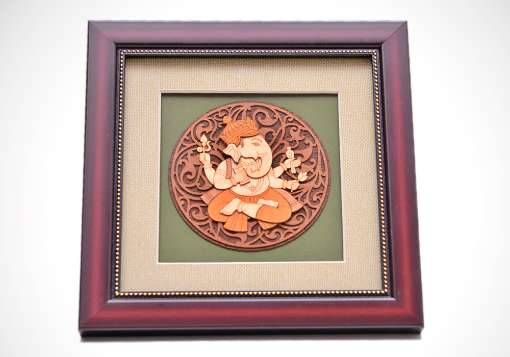 God Ganesha Hand Crafted in Wood in Wooden Frame