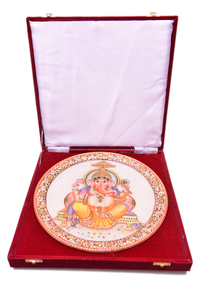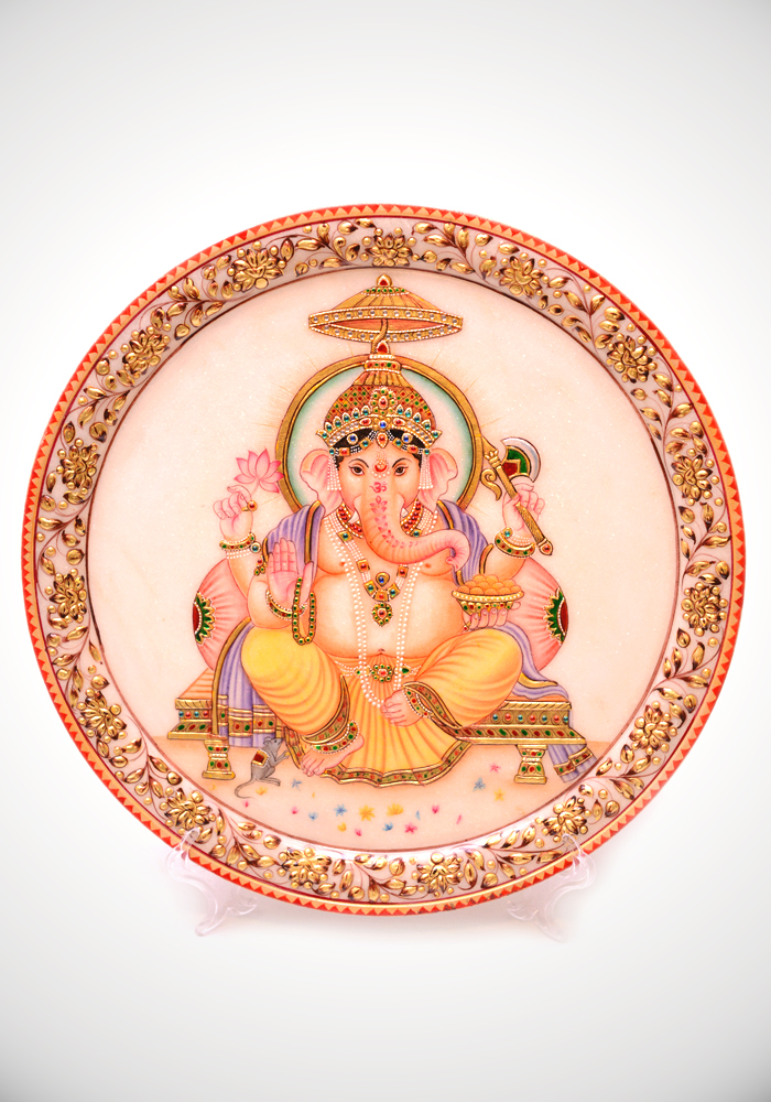 God Ganesha Show Piece Plate Hand Carfted And Painted In white Marble