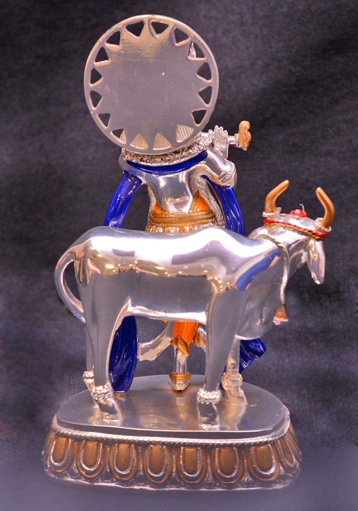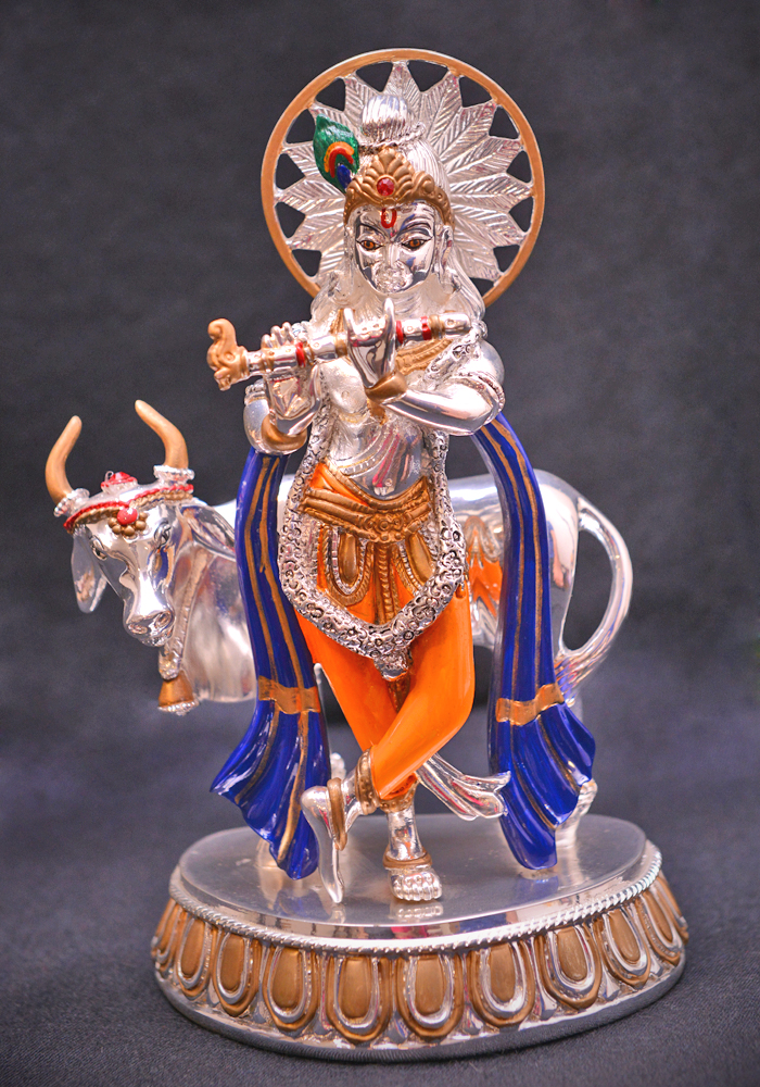 / God Krishna with Cow Hand Crafted And Painted in Real Silver Plating