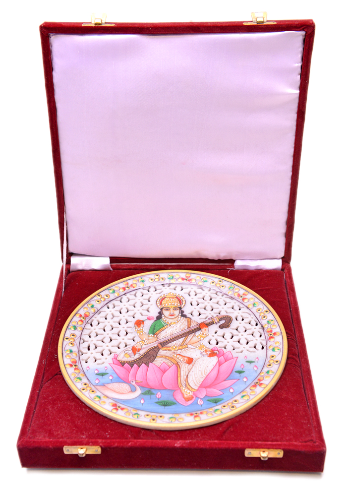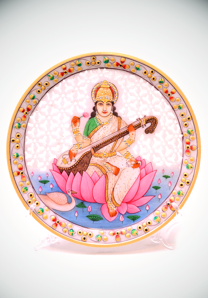 Goddess Saraswati Undercut Show Piece Plate Hand Carfted And Painted In white Marble