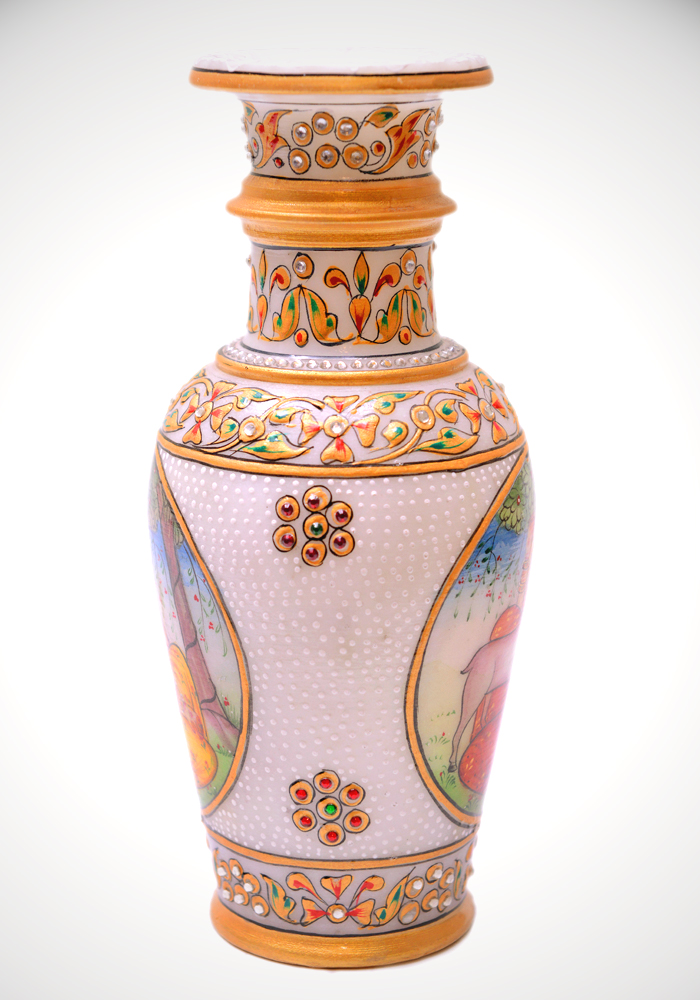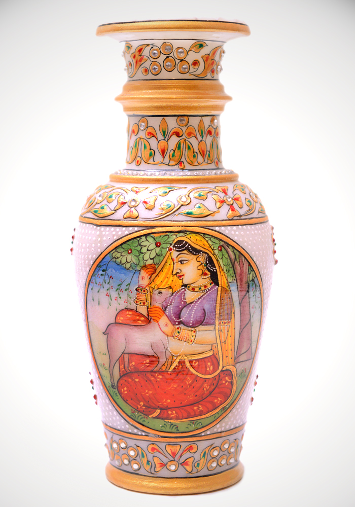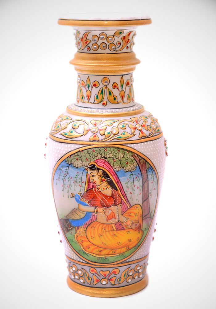 Indian Lady Flower Vase Hand Crafted And Painted In White Marble