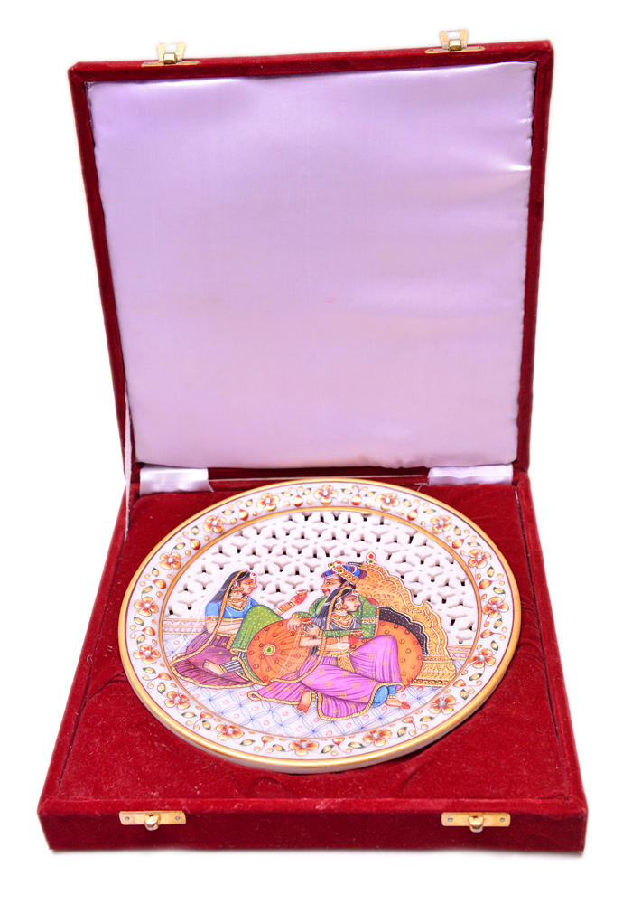 Mughal Scene Undercut Show Piece Plate Hand Carfted And Painted In white Marble