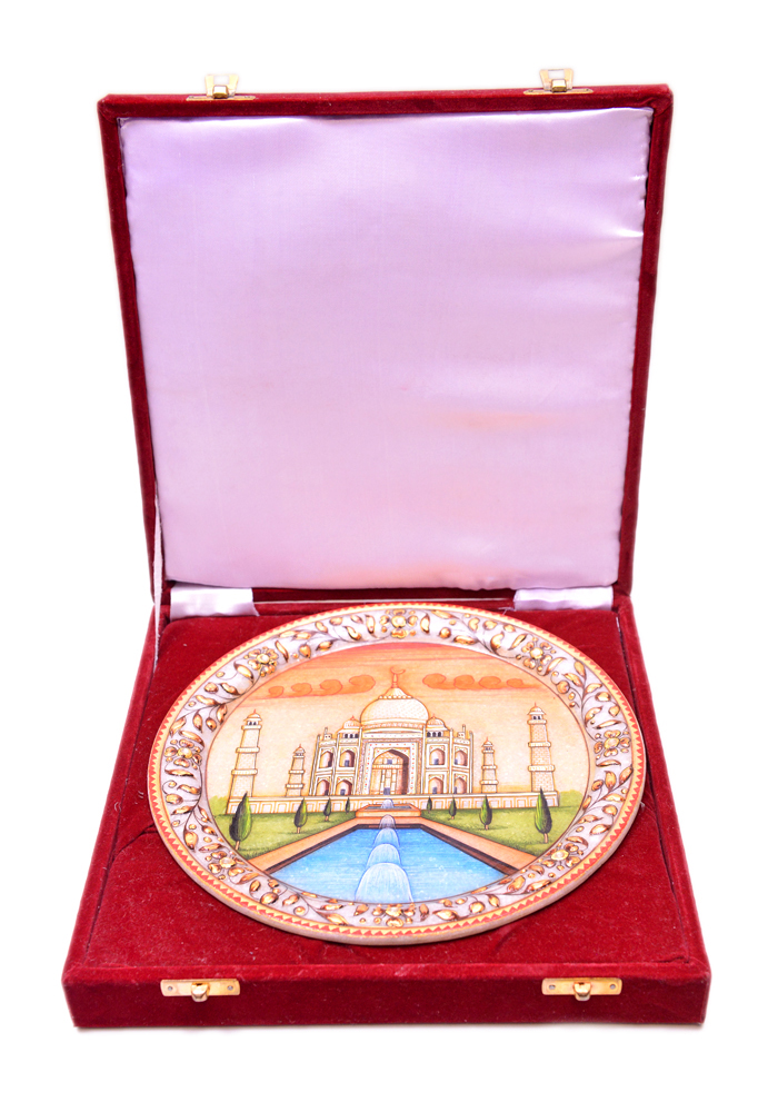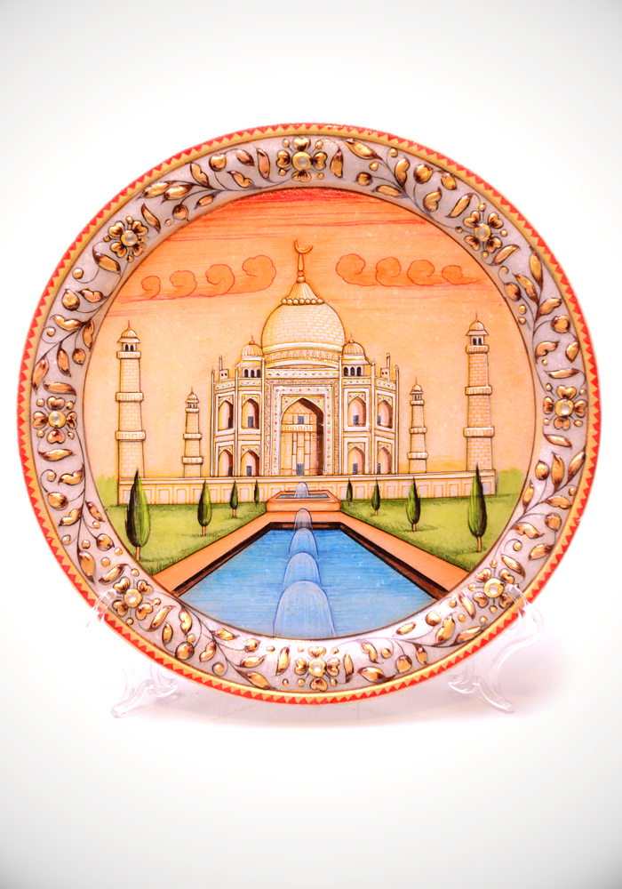 Tajmahal Show Piece Plate Hand Carfted And Painted In white Marble