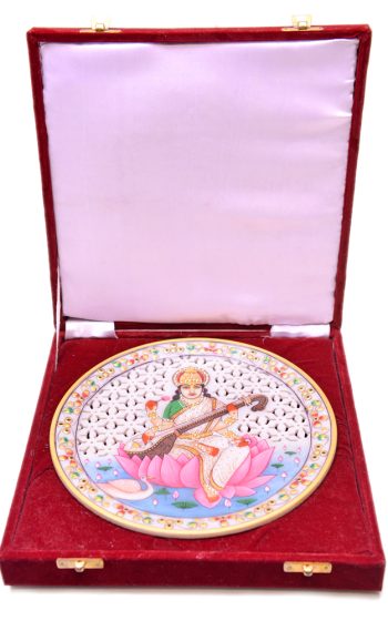 Goddess Saraswati Undercut Show Piece Plate Hand Carfted And Painted In white Marble