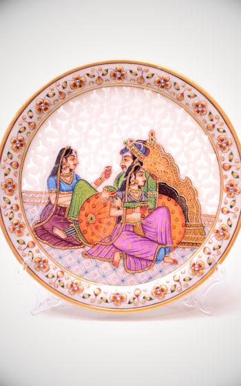 Mughal Scene Undercut Show Piece Plate Hand Carfted And Painted In white Marble